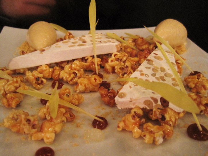 Heirloom has a most curious dessert menu, one that elegantly fuses Eastern flavours to Western dessert foundations, and changes seasonally, listing four options available, as well as a lighter fifth option of a macaron tasting plate for the not-so-very-sweeth-tooth person. On our first visit, we selected two irresistibles. The first irresistible sampled was the “Burnt Butter Icecream and Caramel Popcorn” ($16). A spectacular autumnal creation of gold, cream and browns that reminded us of the beautiful countryside. Perched on a bed of caramel popcorn that perfectly evoked childhood days at carnivals, two large wedges of sticky honey-and-pine-nut nougat conjured up images of cows grazing on a farm field. Accompanying dollops of delicious burnt butter icecream resembled machine-turned haystacks. The irresistible was further decorated by (unedible?) golden corn shoots stuck to the plate with salted caramel drops, and a few slightly strange opqaue droplets of a piquant wasabi-like taste.