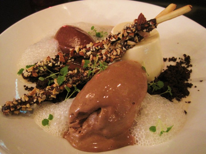 The second irresistible was a stunner in all aspects – taste, flavour, presentation, price. May we introduce the “Chocolate and Soy Bean Blancmange” ($15). By contrast to the golden wheat fields of the first irresistible, this second irresistible evoked a lush rainforest. The rather old-fashioned blancmange was given a contemporary lift by being lightly flavoured with soy bean. Forming a cream-coloured hill, the blancmange was surrounded by a luxuriant shrubbery undergrowth of rich chocolate and subtle honey icecream, a mist of malted foam, and a forest floor of grounded chocolate biscuits. This was overlaid by two elegant branches of crunchy Poky biscuits, dipped in chocolate and smothered in nuts, perhaps to resemble typical lichen-covered foliage.