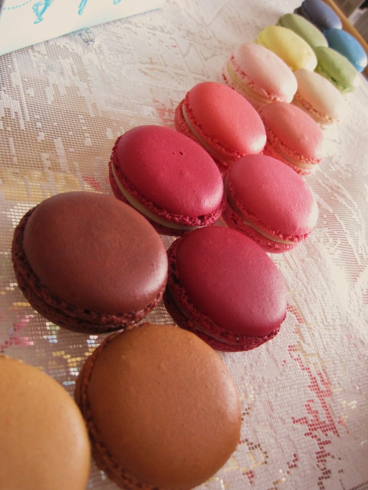 And our lovestory continued on a regular basis thereafter, a few macarons here and there, for afternoon sugar hits, for cake decorations, for friends’ birthday gift accompaniments, for family treats. Each and everytime, service was friendly, easy-going, warm. We have lately decided to do La Belle Miette true justice, and hence we recently purchased a full set of all the flavours available ($2.50 each, $2.80 for the chocolate one) for our readers’ vicarious enjoyment…and ours, of course. Note that we re-arranged the macarons into a rainbow below, because we have a slightly better eye for a more photogenic colour palette than the rather good-looking young man working that day, oh la la. 😛