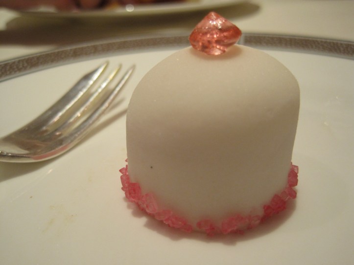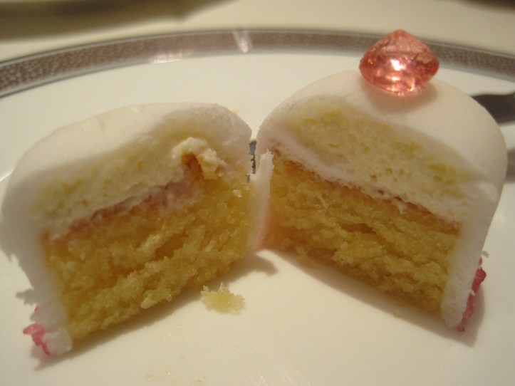 The first sweet irresistible sampled was the Asprey Diamond — a sponge-like cake with a thin layer of cream and jam at its heart, delicately iced over with a layer of white fondant, its skirt hemmed with edible, luminous pink jewels.