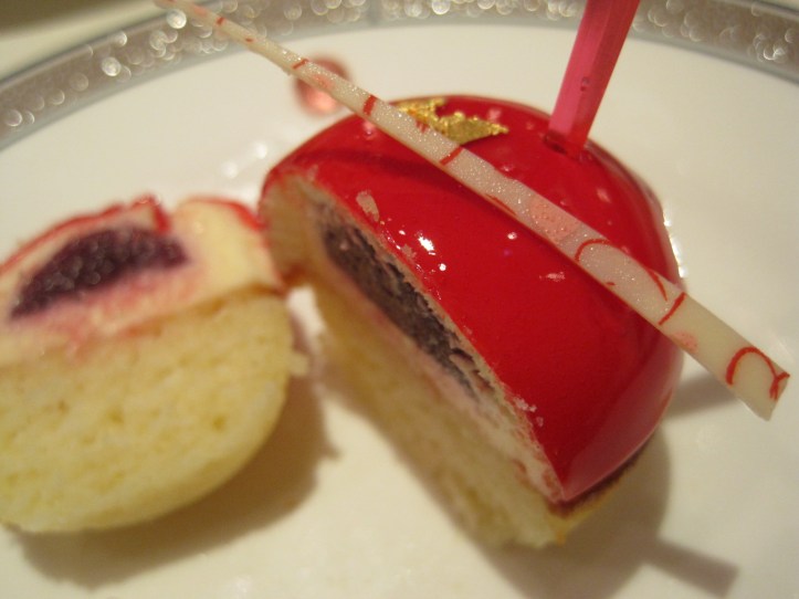 The next irresistible was the Delices de Cartier — a cute, round cake containing a sponge base with an intensely-flavoured grape mousse centre, its top glazed red and embellished with a touch of iridescent gold leaf and a flake of white chocolate.