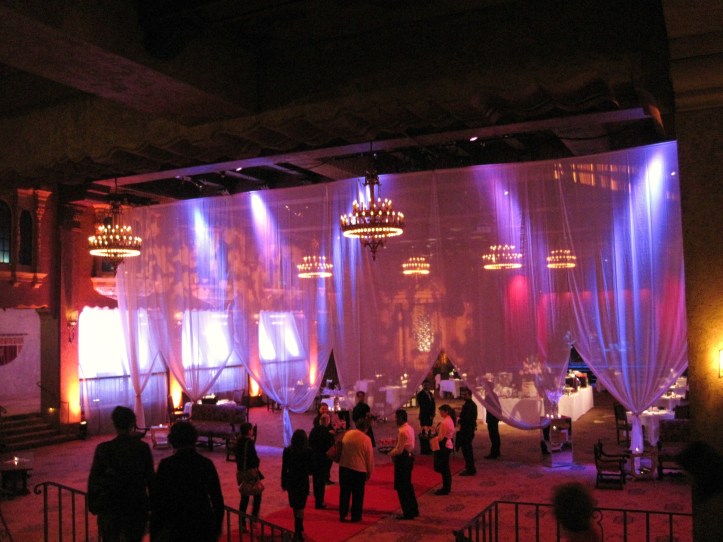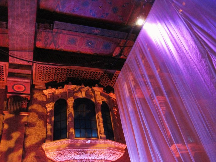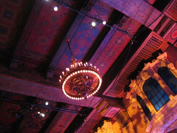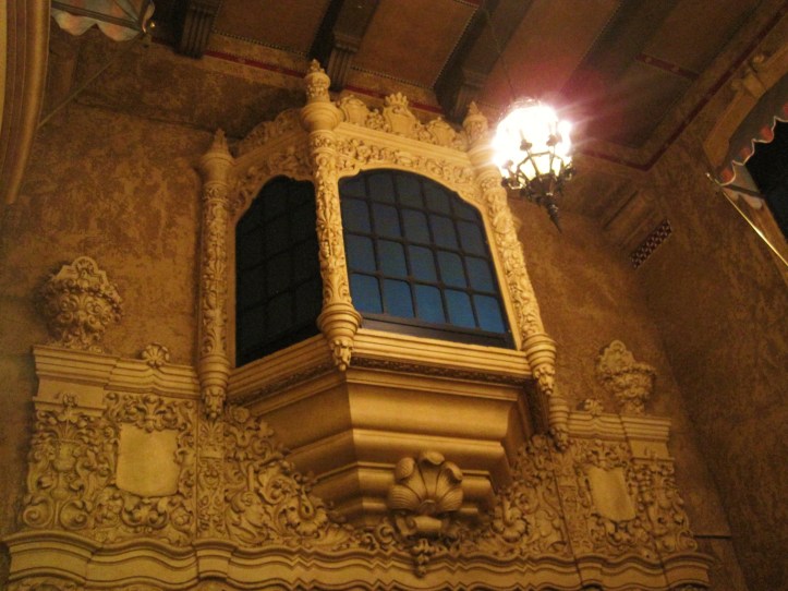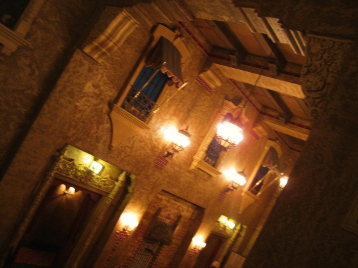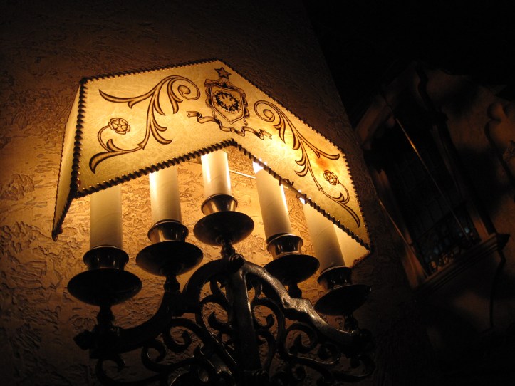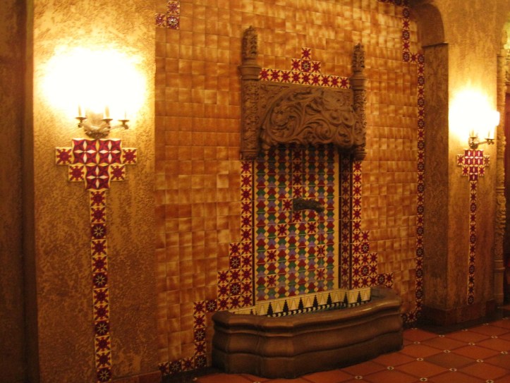 At the landing of the filigreed iron stairs, we entered a lobby foyer akin to a Spanish-style piazza courtyard. With a design sensibility heralding back to the 19th century Spanish Rococo period, the floors were tiled with ochre diamond tessellations. Moorish mosaics lining a side fountain made pious crosses, while ornate candlebras mounted on the walls highlighted the intricate roof-to-floor masonry work. Heavy drop pendants from the ceiling cast a pervasive eerie glow that would have perfectly suited Gaston LeRoux’s Phantom.
