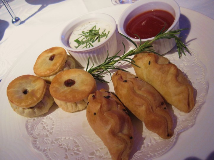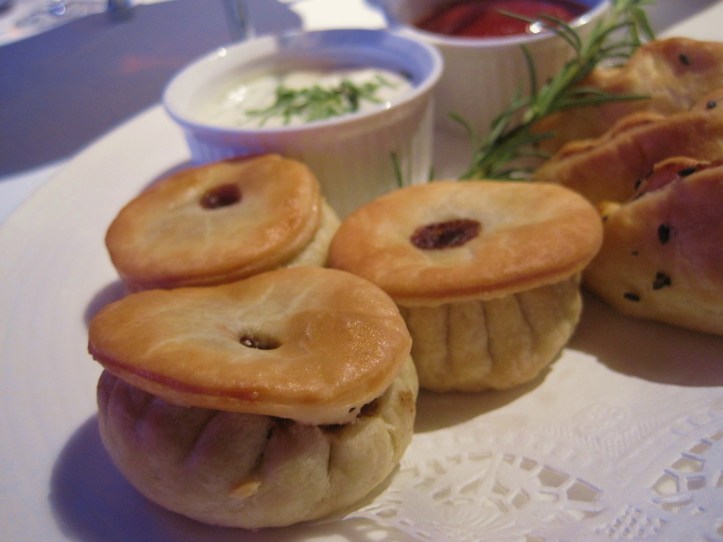 Almost as soon as we finished the tier of ribbon sandwiches, out came a plate of HOT savouries! MoMo & Coco has rarely had HOT savouries in a high tea – how splendid…nom nom nom! These hot savouries included a hearty osso bucco pie with tomato sauce, and sweet potato pasties served with minty yogurt.