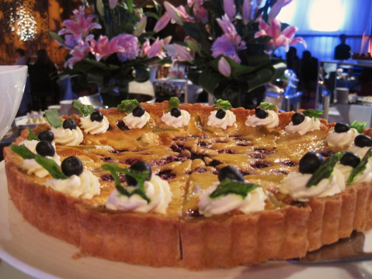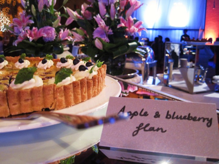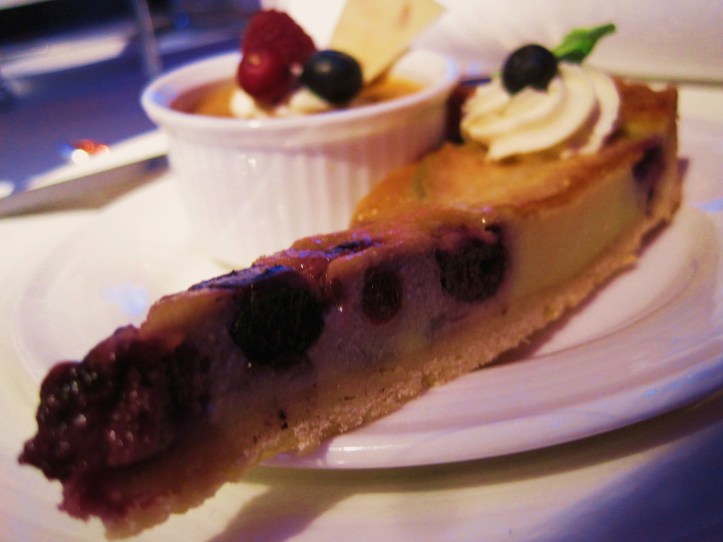 Second irresistible — apple and blueberry flan with Calvados anglaise sauce. A lovely summery-looking irresistible that momentarily made us forget it was pouring rain outside.