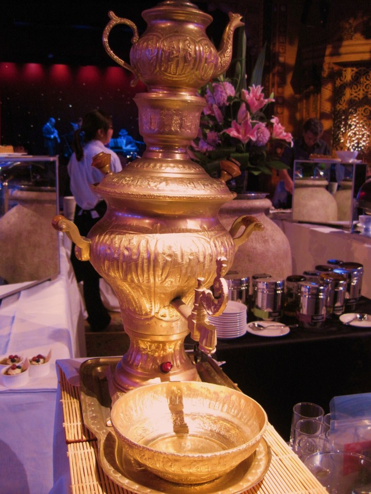 The grand doors swang open at exactly 2.00pm, and behold what a sight! We stepped carefully over the plush red carpet to be greeted by an entourage of smiling, uniformed staff. They offered glistening crystal glasses filled with pink moscato, sparkling wine and fruit juice. Beyond the swathes of opalescent drapes that evoked a mystical Persian harem, we counted maybe 10-15 linen-dressed tables for the afternoon tea participants, each serviced by two staff members (one who was responsible for the food, and the other for beverages/tea). Old-fashioned Spanish-style candelabras dropped from the high, ornate ceilings, and soft blossoms of orchids and tealight candles graced each table. A string quartet serenaded the guests for the first half of the afternoon with classical romantic-period and jazz melodies, before shifting to softly-accented spanish dance music.