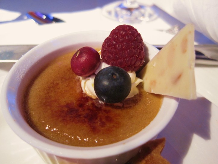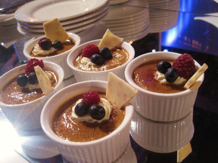 First irresistible to be sampled — the vanilla caramel creme brulee, with a hint of coffee, and topped with blueberries and raspberries, a touch of cream and a white chocolate wafer.