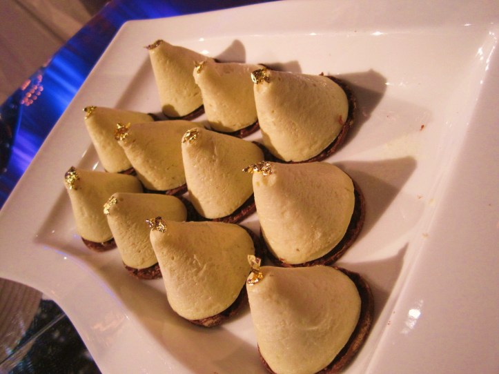 The fourth irresistible — subtly-flavoured Baileys baked cheesecake, fashioned into cute pyramids, topped with a flash of edible gold leaf, and a crispy, slightly gingery biscuit base.