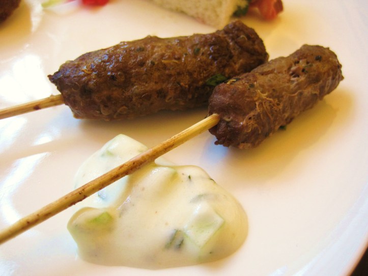 The traditional three-tiered service was not used here. Every component of the high tea was buffet – serve yourself, eat as much or as little as desired, and have no fear because everything is frequently replenished with more and more. The first buffet tackled were savoury irresistibles, with the famoust head bust of Nefertiti serenely gazing after us. From memory, there were six different types of ribbon sandwiches and three types of hot foods. The ribbon sandwiches included a mix of white and multigrain bread, with fillings of queenly cucumber, honeyed ham, roasted beef, creamy chicken, scrambled egg, and smoked salmon. The hot savouries included circular knobs of falafel served with tahini, hearty lamb kofta kebabs with subtle minted yogurt, and a small chicken casserole pot (the latter which MoMo & Coco forgot to photograph in the excitement, apologies).