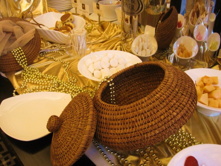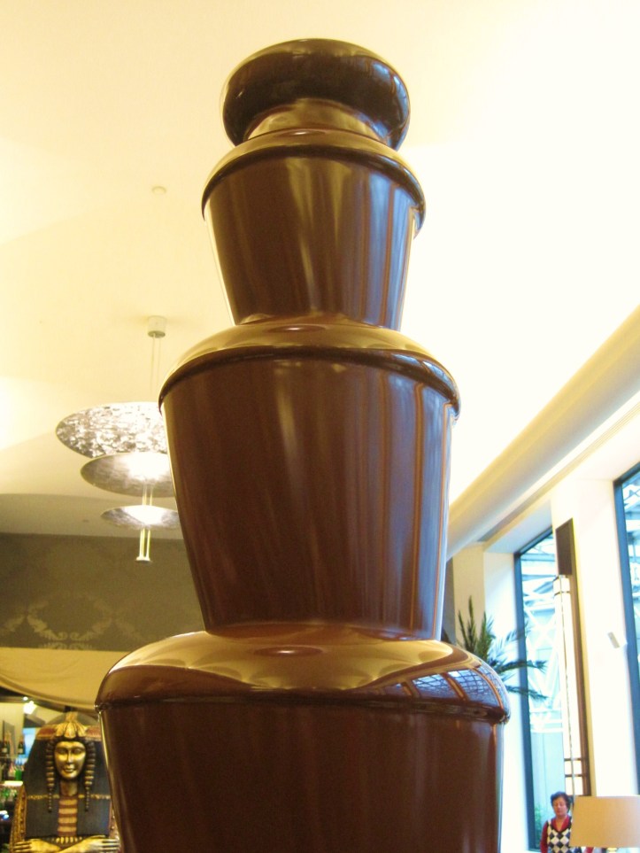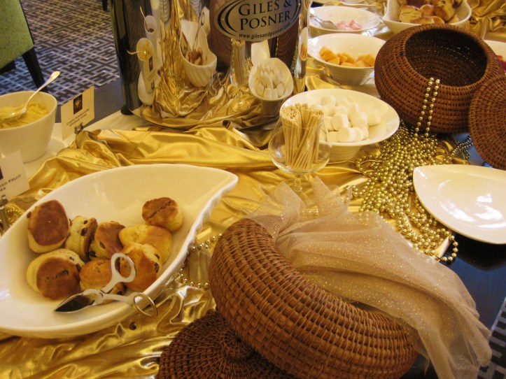 The second buffet table was set up as an oasis, with a massive chocolate fountain standing between two palm tress, accompanied by bowls of melons, berries, marshmellows, turkish delight and crystallised ginger to dip into the fountain, and embellished by lurid gold tablecloths, gold beads, gold gauze, gold, gold, gold. What a mirage!