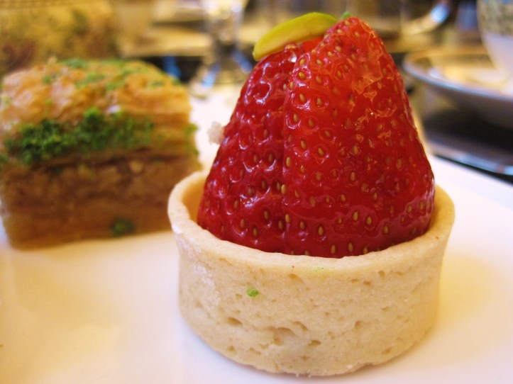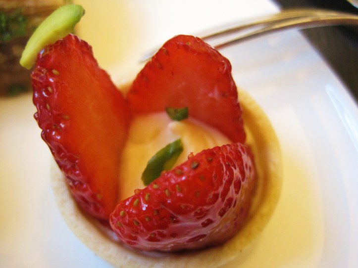 The second irresistible on the second plate of petite-fours was a strawberry tart, made of three fresh succulent strawberries sitting over a bed of cream, garnished with shredded mint leaves, and encased in a slightly thick pastry cup.