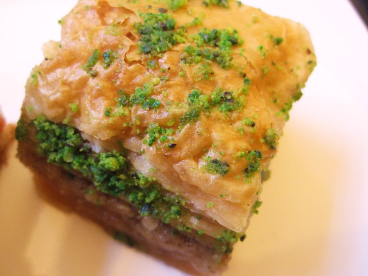 The third irresistible on this second plate of petit-four was another item that made the party’s list of favourite irresistibles. Layers upon layers of thin pastry, soaked in honey, scattered with pistachio = baklava…hmmmmm…irresistible…(and yes, the pistachio flakes were certainly as luridly-coloured, as pictured).