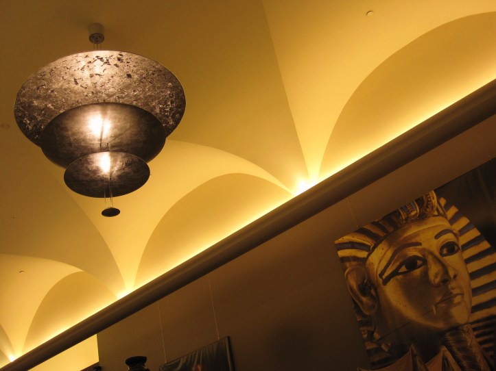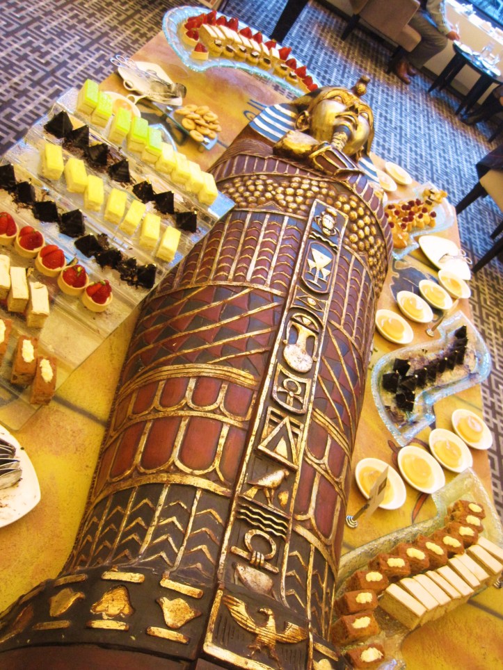 And so we come to the third and final buffet table – a dessert buffet masterpiece of irresistibles, arranged in crescent-moon-shaped glass trays (a nod to Islamic influences, perhaps?), S-shaped glass platters (symbolic of cobras?) and stepped plateaus (a nod to the step pyramids at Sakkara?) around a gilded sarcophagus (a coffin in any other language). Such a wonderful spread of irresisitibles to possibly raise the dead, no?