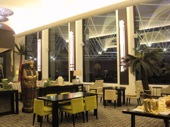 In the afternoon that we visited, the suprisingly contemporary Sofi’s Lounge on the lobby floor of the Sofitel was decked out with posters depicting the often-seen death mask of the boy-king Tutankhamun and richly decorated sculptures of sphinxes and mummies. There were four, somewhat rushed but unfailingly courteous, wait staff servicing the guests, two dressed in Indiana Jones outfits, another two very suitably as Pharoahs with gilded neckpieces and cuffs, and a graceful Cleopatra in white linens and golds. MoMo & Coco absolutely regrets not finding the courage to ask them to pose for the camera.