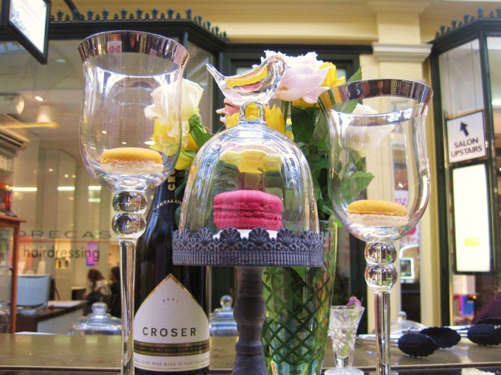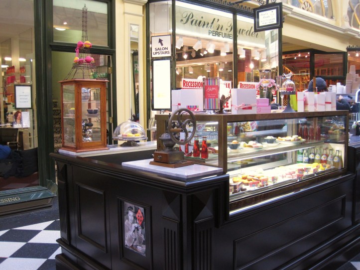 Melbourne has long been considered the more “European” of Australian cities. Nothing captures that vibe better than the old-world charm of several heritage buildings. There’s the la belle epoque style of the Georges Apartments (MoMo & Coco’s dream city apartment block), the colonnaded grandeur of the old ANZ Bank, the subterranean sumptousness of the Plaza Ballroom, the landscaped vastness of the Royal Exhibition Building, and boutique shopping arcades nestled within the colonial General Post Office, the Victorian-era nostalgia of the Block Arcade, and the restored Renaissance Revival decor of the Royal Arcade. The Royal Arcade is full of beautiful surprises. Connecting Little Collins Street and Bourke Street, natural light cascades through a full-length canopy of skylights framed by elegant wrought iron supports. There’s a myriad of trinket, ecletic vintage fashion, jewellery and two chocolate boutiques. In a time that Melbourne aimes les macarons à la folie (literally, loves macarons to madness), a newly-opened suprise off-shoot of a long-standing cafe has also found a home in the Royal Arcade, a sweet specialty boutique specialising in macarons.
