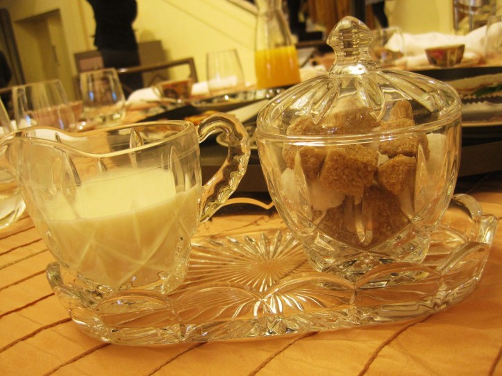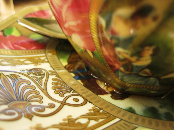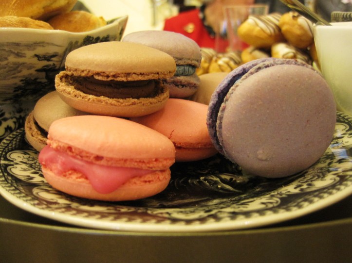 The table setting of the afternoon tea was genteel elegance. Napkins were creamy white, embroidered with a cursive flourish of an “M” for Myer Mural Hall. With antique-collecting as one of MoMo & Coco’s past times, we could appreciate each exquisite detail of the porcelain dining ware. The main plates followed the blue and white tones of Delft porcelain. A few irresistibles were displayed on gold gilded platters of Limoges porcelain, swathed with luscious rose blooms. Teacup sets alternately featured Fragonard images of serenading lovers admist rose gardens, and porcelain so finely painted that it evoked the rippled effect of English guilloche enamelling. Milk and sugar cubes were prettily displayed in hand-cut crystal wear. Tea was unfortunately most limited in range, and came in tea bags – a possible faux pas in the institution of afternoon tea.