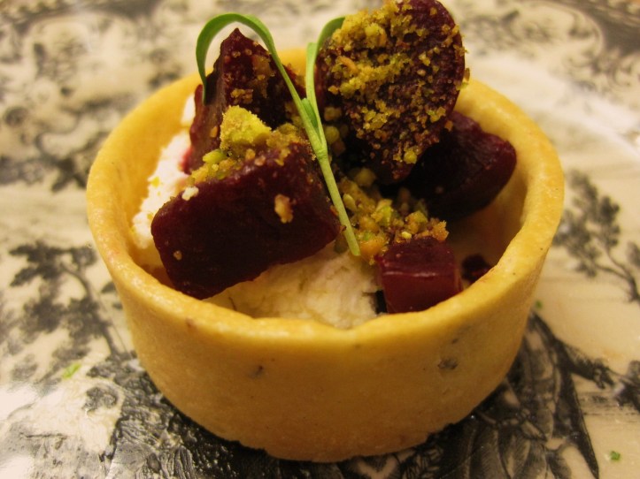 Of the savouries, there were two ribbon sandwiches, one of a ham and cheese and another of creamy poached chicken and mayonnaise. Also present, many square slices of quiche lorraine and frittatas, and too few of a tartlet of beetroot and fetta.