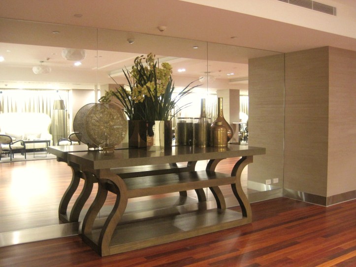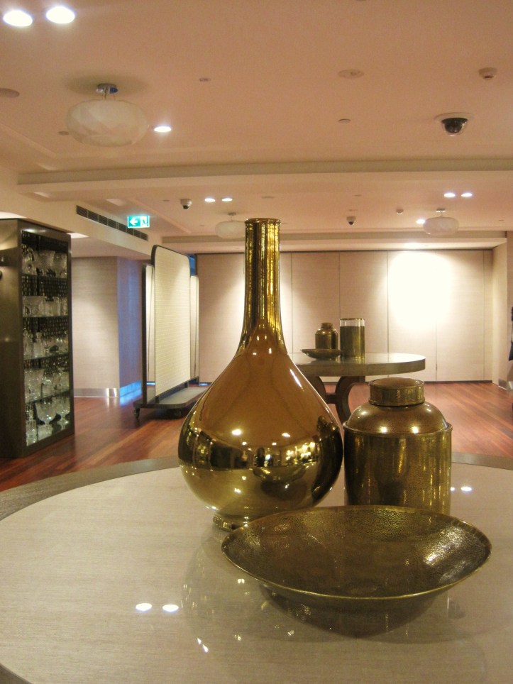 Enter a modern hallway, decked out in warm oaks and gleaming grey tones, highlighted in the bright halogen downlights. See tables of sleek lines, and featured centrepieces of brassy fluted vases, deep-dish bowls, and milk can-like canisters. Glance at shelves lined with etched glass ware from the renowned crystal houses of Villeroy & Boch, Waterford, and Royal Doulton, throwing prisms of light across the floor. Continue, passing a trio of semi-enclosed dens of plush high-backed pale gold settees and chaises.