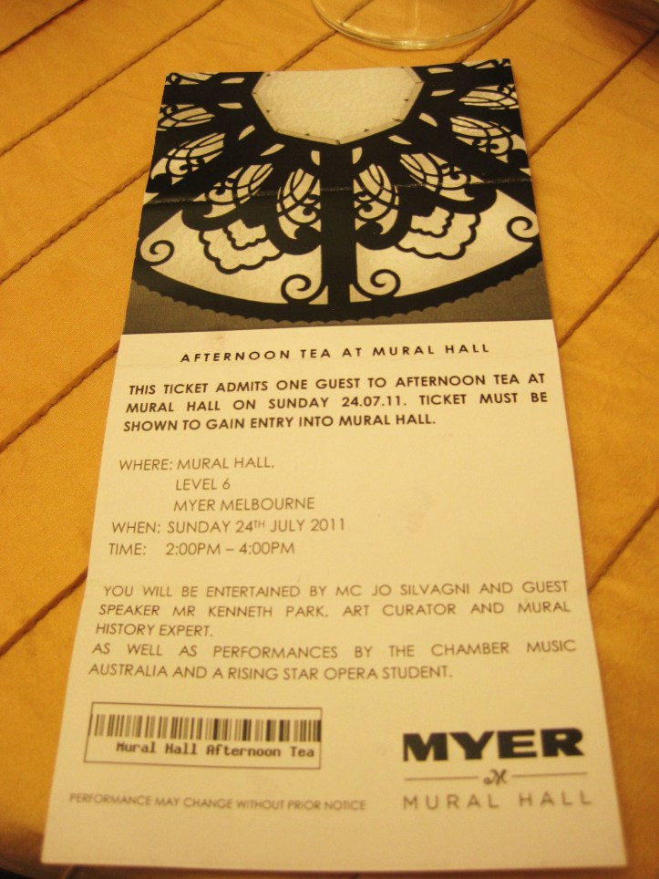 Overall, imagine what a guided tour with Insight Vacations or Abercrombie & Kent would be, and the afternoon tea experience at Myer Mural Hall is analogous. It isn’t a mass-market boozy Contiki thing. Indeed, one would not be advised to visit if one was an incorrigible hippy (the dining crowd is of a certain maturity). One would also not be advised to attend if food was one’s only concern (it rates poorly in tangible value-for-money terms). Myer Mural Hall is also not for the person seeking an intimate, private afternoon tea affair (unless you manage to fill a table of 10, you will be seated with strangers). Rather and nonetheless, afternoon tea at Myer Mural Hall is an opportunity to re-discover a long-lost dimension of going-out and dining-out — where food wasn’t the centre of everything, but rather, it was the polished service, well-versed company, an ambience of exclusivity, and a venue of sheer architectural grandeur that made for an all the more dazzling, memorable experience in a forgotten, beautiful, rarefied realm of old Melbourne.