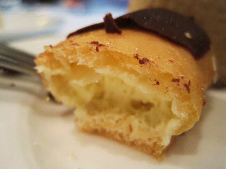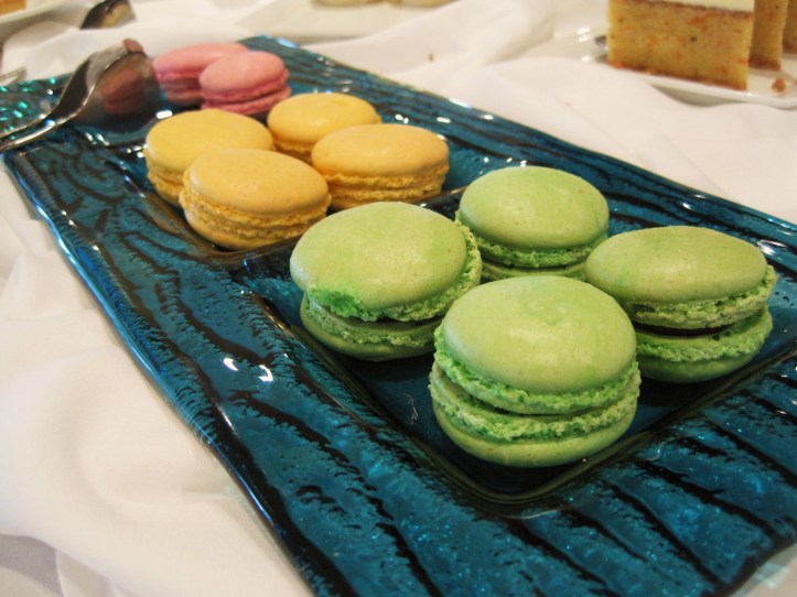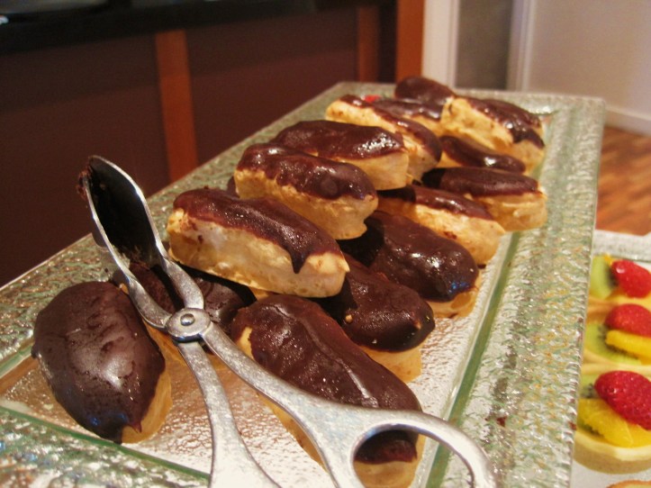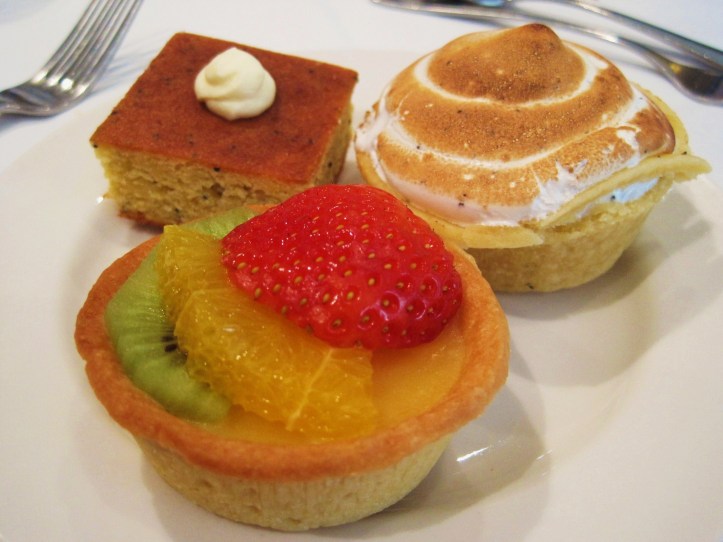 This was MoMo & Coco’s first plate of irresistibles from the high tea buffet, consisting of fairly traditional, classical dessert fare that is easy on most palates. The first irresistible from this first plate was a square of orange poppyseed cake, with a moist texture and a tiny dollop of cream cheese frosting. The second and third irresistibles were two lemon numbers: a lemon meringue pie possessed a soft meringue swirled on top of a zesty lemon curd base; and a fine and dandy lemon tart with a musketeer troop of glazed orange, kiwi and strawberry conferring a dash of colour.