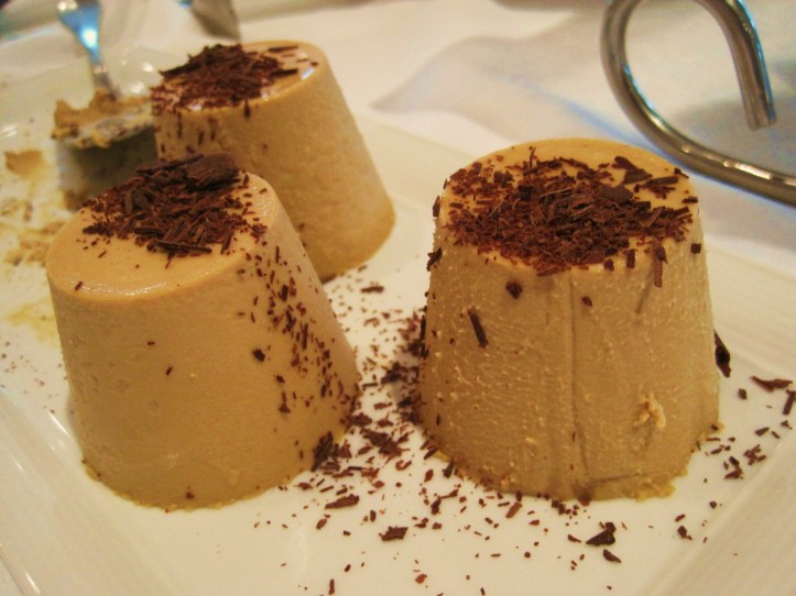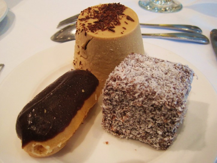 The second plate of irresistibles selected by MoMo & Coco moved to less fruity, slightly heavier but no less irresistible dessert fare. An eclair was all golden choux pastry encircling a tubular interior of custard. A good French pastry should make a mess when one cuts into it, and it sure did here. A large cube of so very Australian lamington was a disappointing dry vanilla sponge, dipped in chocolate and flecked with coconut. The third irresistible on this second plate was a large upturned cyclinder of robustly-flavoured coffee panna cotta, with a creamy, light texture and flakes of chocolate scattered on top.