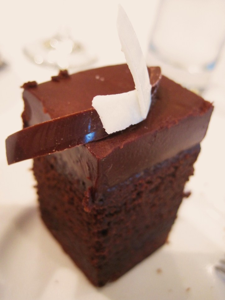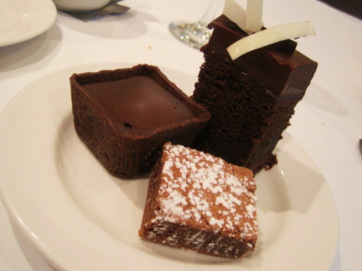 MoMo & Coco’s finale plate of irresistibles was an extravaganza of chocolate, sugar, butter, and diabetes. 🙂 Dusted with icing sugar, a moreish square slice of chocolate brownie was simply baked perfection. With a light chocolate biscuit base, a tart shaped as a chocolate cube cupped silky chocolate. A tower of a mud cake was pure decadence — rich, moist, chocolate, iced over with a luxurious ganache and decorated with twirls of dark and white chocolate.