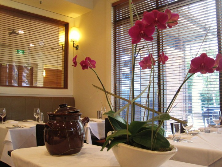Departing from the increasingly annoyingly repetitive Melbourne CBD-norm of dark-wooded bistro dining, the Sebel Heritage’s Bella Restaurant was all starched, white-linen formality and polished, prompt, faultless service. The dining audience was demurely genteel — a few tables of the traditional afternoon tea demographic of grey hairs and twin-set pearls, a corner romance, small quiet groups of young ladies and a subdued hen’s party discreetly secluded in another room. Dramatic florist works featuring Australian native flowers of luridly orange Kangaroo Paw and garnet globes of waratah cohabited with posies of English David Austin roses and magenta Singaporean orchids. Stem ware were filled with sparkling wine. Plates and tea ware were plain unadorned white. Tea was forgettable, self-serve with tea bags – a possible faux pas in the institution of afternoon tea.