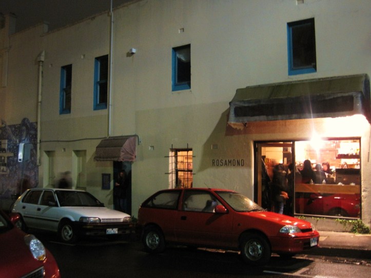 The concept of “pop-up” stores have long existed in the fashion world. Before the advent of the likes of Net-A-Porter and Shopbop etc, and before department stores in Australia found it necessary to compete with such international offerings, “pop-up” stores were MoMo & Coco’s first source for seasonal designer imports and designer sales. If there has been a positive consequence of the post-Global Financial Crisis (some would say, still ongoing), it has to be the emergence of “pop-up” food-oriented shoestring operations that exemplify a spirit of small business entrepreneurialism against a melancholic backdrop of rising housing and rental prices. While the US may be the epicentre of the financial crisis and this “pop-up” food phenomena, Melbourne too has increasingly had its share of “pop-up” restaurants, cafes, bars, and even a recent “pop-up” truffle boutique and food truck. Being the insatiable sweet-tooths that we are, MoMo & Coco have been particularly attracted to “pop-up” vendors of sweet irresistibles — we remember a joyful pre-Christmas sweet shopping at a Baker D Chirico “pop-up,” braved the hoards at a laneway cafe for a “pop-up” macaron maker, and recently divulged to our readers, our long-held cupcake “pop-up” secret. With desserts the highlights of a celebratory dinner at Maze, we returned to indulge at a dessert and cocktails “pop-up” bar (a perfect amalgamation of our favourite food groups). The rather business-savvy pre-official shop opening spruiking in the form of a CBD “pop-up” by Burch & Purchese magnetised us to later visit the official South Yarra store. For all that, we have long heard of a certain “pop-up” dessert master. Constructing sweet irresistibles for an elite group of no more than 15-20 patrons in each of 2 or 3 sessions, every Thursday evening, this dessert master has stationed his headquarters in the tiny kitchen of Cafe Rosamond — a little hide-hole with dated furnishings, entered via an inconspicuous entrance opposite a soldier troop of garbage bins, around the corner of gritty Smith Street.