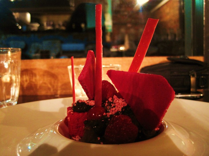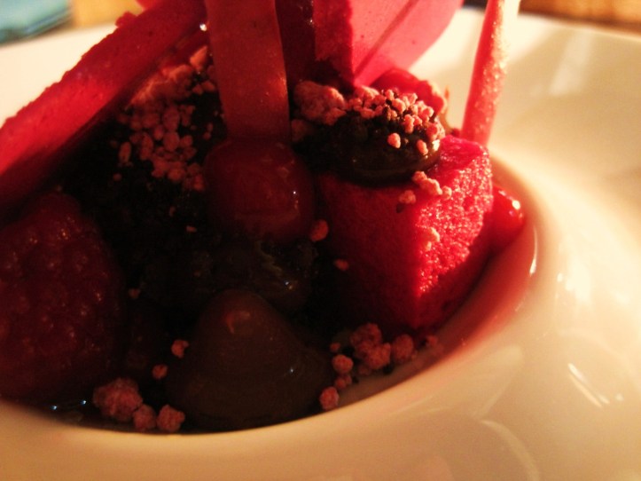 As our first course, the “Chocolate, Beetroot, Raspberry, Cocao” was the miniature stalgamite and precious ore formation as found in the caves of Snow White’s Seven Dwarves. Its foundation consisted of jewel-like droplets of tart raspberry and silky chocolate, creamy parfait-like cubes of raspberry and beetroot, and crackly rocks of raspberry. Countering the sweetness of the chocolate and raspberry, soft airy savoury splinters of beetroot wafer were wedged in to create three-dimensional stalgamites. With a colour scheme as red as Snow White’s pout, we chipped away at this formation of preciousness as carefully and as lovingly as the Seven Dwarves.