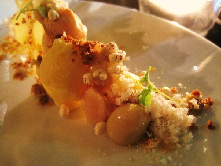 If the dessert test tube made us grin evilly like Dr Jekyll/Mr Hyde, and the first course conferred a soft dreamy smile of a fairytale princess, the second course of a “Popcorn Soup” made us sigh in the same way as Goldilocks with her steamy bowl of porridge. The Popcorn Soup was as pretty to look at as porridge, but one swirl and one spoonful revealed a soulful dose of liquidised salted caramel and caramelised popcorn, balanced with a slightly medicinal tasting biscuit crumble of popcorn that left a dry, powdery palate.