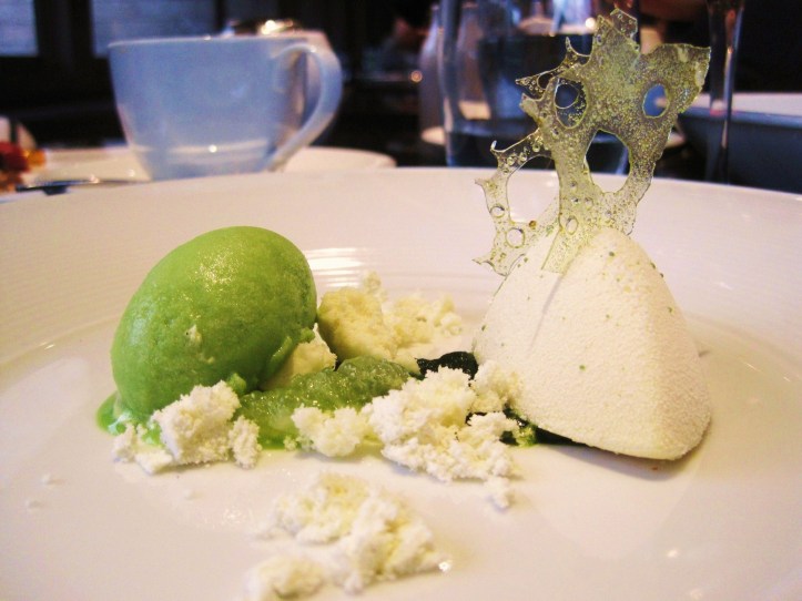 Notwithstanding stunning mains and wine, Persimmon really distinguished itself by its irresistible menu. Of four irresistibles available, the three sampled (excluding therefore a chocolate fondant which was not selected) paid tribute in elemental composition to the botanicals of the Grollo Equiset gardens, and in presentation to the underlying artistic sentiments of Persimmon’s NGV surroundings. Deconstructed, each irresistible also showcased a spectrum of textures and flavours that were unexpectedly, mostly harmonious. The first irresistible was the “White Chocolate and Lime Mousse, Basil and Mint.” A spangled snap of lightly-flavoured mint crested a UFO-shaped white chocolate mousse. Adjacent to this was a jade dollop of vividly-tasting, sinus-unblocking, basil sorbet. A crumbly soil of white chocolate and small wedges of lime were scattered over. With both sweet and sour elements, creamy and light components, it was a refreshing dash in winter and undoubtedly, a light sweet choice for summer, simply hmmmmm…irresistible…
