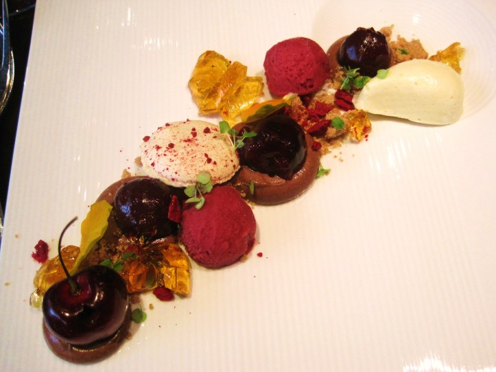 The second irresistible was the “Coconut Bounty, Chocolate Bavarois, Cinnamon Crumble, Spiced Cherries.” Resembling an autumunal forest floor, this irresistible was a magical fairy trail of disparate elements – brandied cherries sitting on piped circles of a milky chocolate bavarois, a mushroom-like vacherin meringue of coconut, spheres of an intense cherry sorbet, luminiscent honey cinnamon jelly butterflies, and a dollop of coconut sorbet, interspersed with foraged watercress leaves and flirty petals. Again, simply hmmmmm… irresistible…