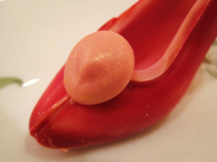 The piece-de-resistance of the third tier of sweet irresistibles was the chocolate stiletto shaped out of white and strawberry chocolate, the latter in three shades of vibrant pink. With even a pink-red sole reminiscent of a pair of Christian Louboutins, this chocolate stiletto was sculpted in dedication to none other than the shoe-loving Carrie, whose shoe wardrobe is the envy of all, including the equally obssessive compulsive shoe lovers writing this journal-blog.