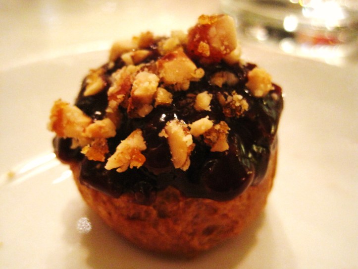 If the English and French had discovered profiteroles earlier, they might not have quarrelled against each other for centuries. The evidence of an eventual union (culinary at least), the Profiterole was a marriage of the French love for chocolate and excess, and the English love for custard and restraint. Captured here in a scintillating choux pastry ball, the just-pralinised nut crusting, rich chocolate-dipped surface, and full luscious custard interior culminated in a sweet dream…a cheeky dream of balls and nuts…