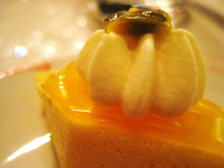 Take a break, sip tea and leisurely cruise the Atlantic to France. Disembark at the Côte d’Azur for a diamond slice of the light Passionfruit Miroir, with as bright a glaze as though it had soaked up all that sun while basking on the French Riviera, and with its mousseline body possessing as subtle a flavour as the je ne sais quoi sartorial style of the French. Swirled into a frothy ballerina tutu, the last mouthful of the cream topping transported one to Paris’ L’Opera arrondissement. Apologies for the below photo: when we attempted to transfer the miroirs from the 3-tiered silver service to our plates, a part of one slice slidded off like the eroding cliffs of Dover over the English Channel.