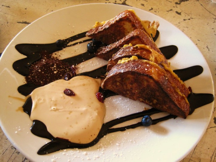 St Ali’s brunch menu reflects nothing of the Middle Eastern origins of the cafe’s name, apparently derived from the Islamic patron saint of coffee, Ali ibn Umar al-Shadhili. No matter — it is nonetheless one of the most adventurous brunch menus of the numerous cafes that MoMo & Coco have frequented in a lifetime of living in Melbourne. All the usual breakfast suspects are present, but interpreted in ravishingly delicious ways, mostly successfully too. For those who prefer savoury breakfasts, the “My Mexican Cousin” (corn fritters) and the aptly-named “Coronary” (a fry-up) are reliable bets. For sweet-tooths on the quest for sweet breakfasts, there are usually three sweet options available — muesli, cake-bread and french toast. MoMo & Coco would recommend that you bypass the too-healthy, why-bother, grain-based option. Instead, enter a feverishly sweet heaven with the following two options (with slight seasonal changes).