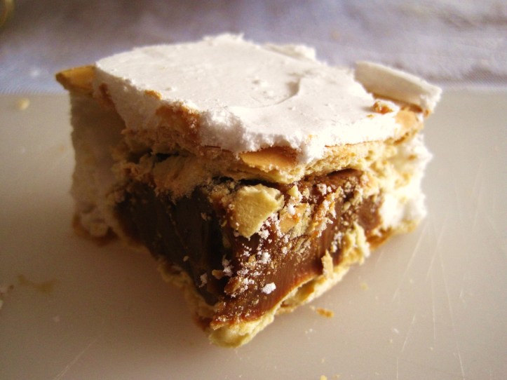 The Chilentos can be likened to a layered Alfajor, with its shortbread sandwich replaced by a meringue cloak. The meringue itself is hard-baked, with a similar texture to a Swiss meringue. It does not have the airy disposition commonly associated with the French meringue, nor the soft swirl of Italian meringue. It has a very generous thick dulce de leche layer too. A MoMo & Coco favourite.
