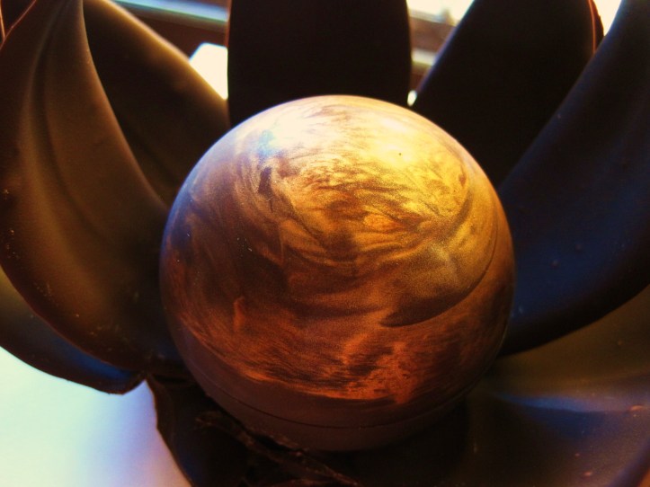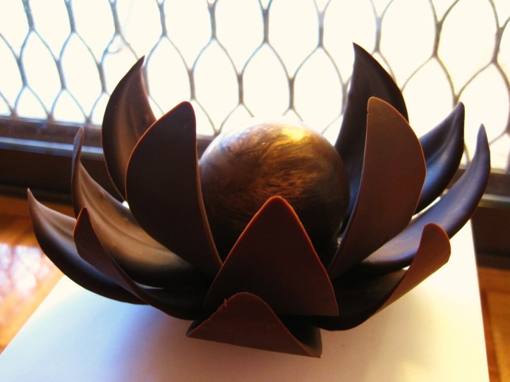 For this blog documentation, below is one of Sisko’s signature pret-a-porter flower sculptures, priced at $45 for this smaller lotus-shaped sculpture. There is a larger version that resembles a waratah bloom at $65. Both are available in dark, milk and white chocolate renditions. In MoMo & Coco’s experience, the dark chocolate is a little too bitter for our personal preference, with a strange woody aftertaste; and we don’t like anything white chocolate. Sisko’s milk chocolate by contrast is our preferred chocolate type, not too sweet, not too dark, unfolding with a slight bouquet of berries, running like a rich red wine, and ending dry and somewhat oaky.