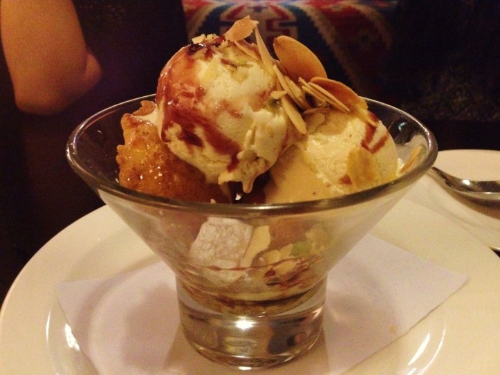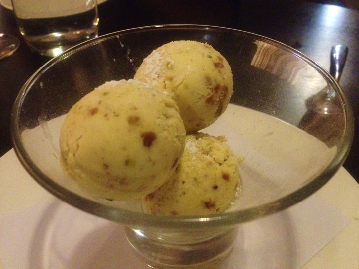 As this is an abbreviated “Travel Post,” let’s move on to the desserts now. MoMo & Coco have a particular soft spot for Middle Eastern desserts. At Xanthi, sweet-tooths were very well-catered, tempted by an extremely irresistible, extensive dessert menu of 7 options (and 3 ice cream options). We selected the three that we have not seen at other Middle Eastern restaurants. Bypassing the vanilla bean and baklava ice cream options, the first irresistible sampled was the “Olive Oil Ice cream ” ($9). Three pale green orbs were delicately infused with Elea Cretan Extra Virgin Oil to culminate in a smooth mouthfeel, with sweetness conferred by the enfolded nuggets of dried figs. Quite lovely.