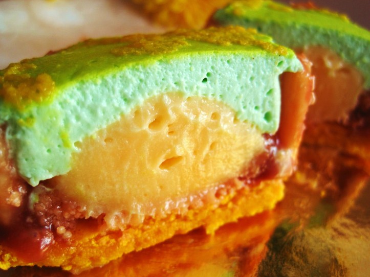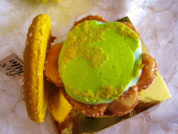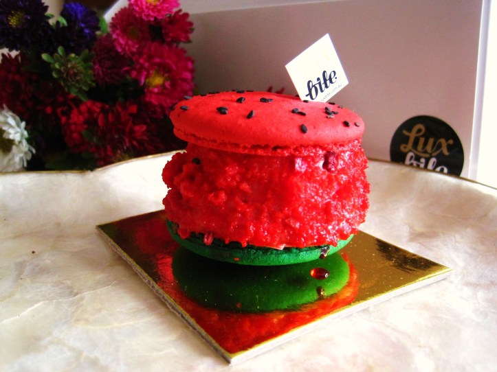 Where Luxbite’s normal-sized macarons fail, its larger macaron cake-desserts succeeds — their slightly crunchier texture provides the ideal textural counterbalance to the respective sweet, soft components of each macaron cake-dessert. Don’t miss these macaron cake-desserts at Luxbite. First up to show you, the Summer Love ($8.50) — a slightly bubble-gummy-accented watermelon macaron that verged on sickeningly sweet,Ā an issue ameliorated byĀ an addictiveĀ filling inflected with discernible tones of green tea, coconut and a refreshing endnote of peppermint. This wrapped around an exquisite centre of hard lychee jelly cubes. Lovely.