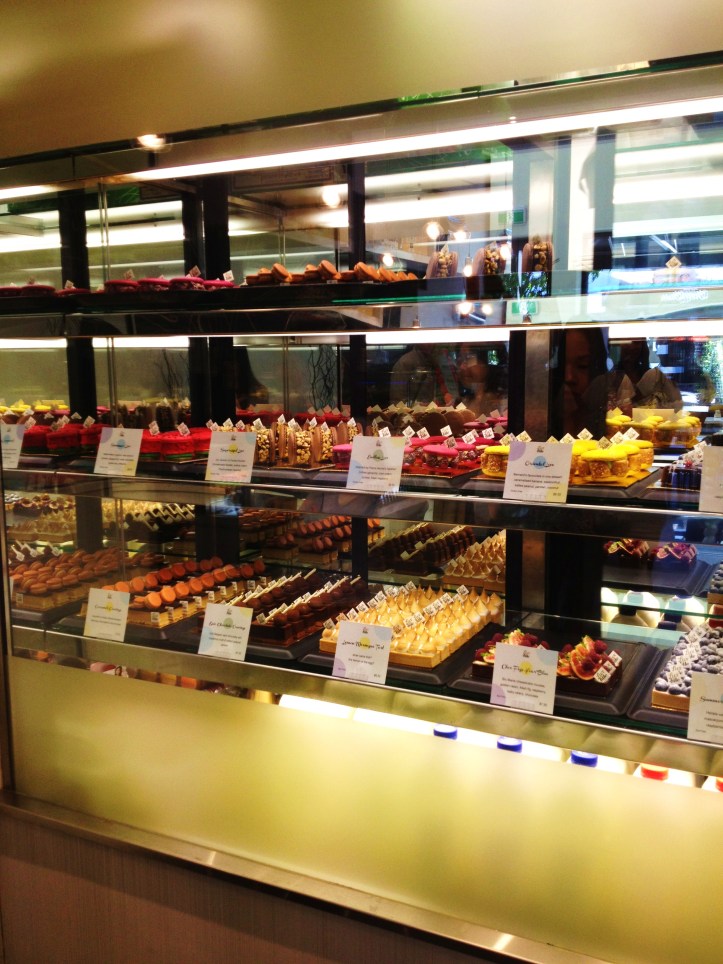 Beyond the compact white tables and chairs, one does not know where to look first — the partly concealed kitchen with pastry chefs toiling away but always chatting and laughing, or the show-stopping counter display exhibiting round discs of intensely neon-coloured macarons, or a mirrored cabinet illuminating technicolour cakes lined up like legions of sentinels on a march to death by sugar. Is there any better way to go? šŸ˜›