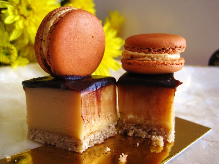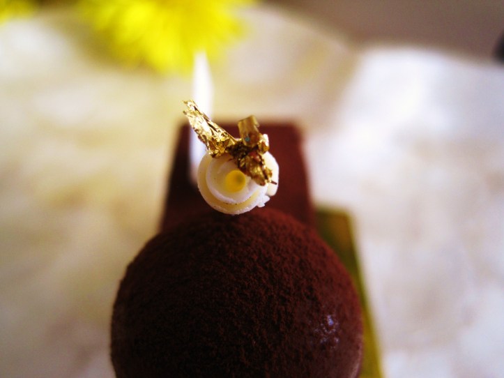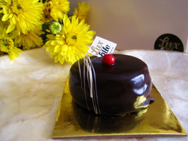 Let’s start simple and sweet. The Caramel Cravings ($7.50) is a nicely sculpted rectangular brick of…sugar — the caramel centre is fudge-like and requires less sugar and more burn. It sits on a splendid lightly-infused coconut biscuit base, spread over with a luscious sticky chocolate ganache layer — the two great components of this cake.Ā It’s embellished with two miniature macaron that tend to have too salty an inclination.LuxBite8d