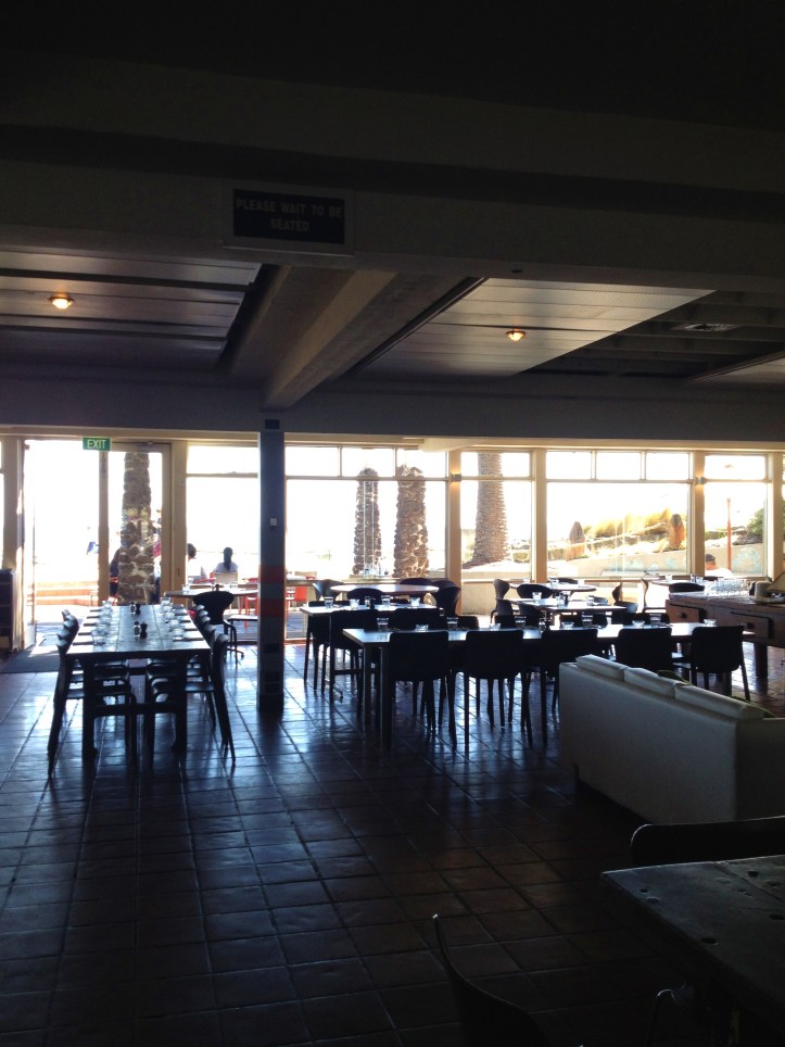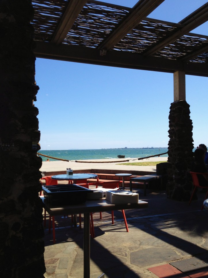 Stokehouse on the St Kilda foreshore has been a long time favourite of MoMo & Coco and our family. Although our parents have, we have yet to dine upstairs, saving that experience for something rather special. đ However, we have visited downstairs many many many times, and it is this less formal area that we document here. With a frontage exuding a converted beach house character, the airy, informal downstairs dining area is furnished in simple monochrome lines. Tables are arranged to allow patrons to take in the best of the sea views, and there are also lounges to cater for those who prefer a lazy cocktail twilight hour.  Long floor-to-ceiling glass windows overlook a terraced outdoor seating area and the St Kilda beach. It’s picture-perfect during day, afternoon and night.