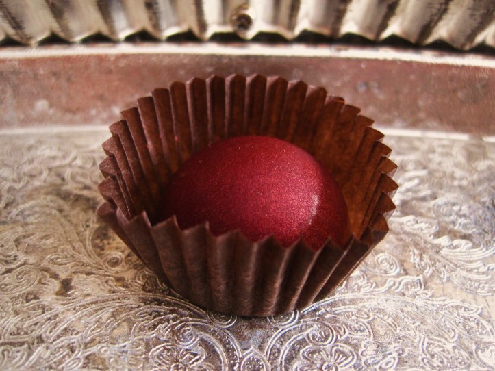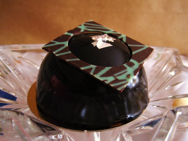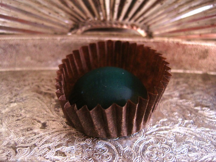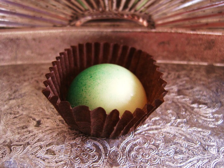 Encase in a white chocolate orb with one half sprayed in a grass gree tone, the Basil is lighter in flavour-power than the Menthe, distinguishable by a touch of a herbal aftertaste. It isn’t as memorable a chocolate bite, unfortunately.