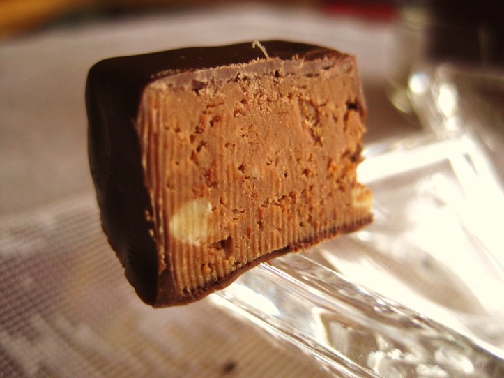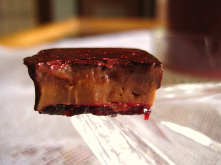 The Shocolate is constituted by a thin slivers of jam-like raspberry jelly sandwiching a layer of a smooth, somewhat overly sweet ganache that enfolds a nutty tone.