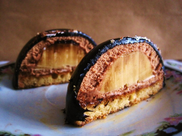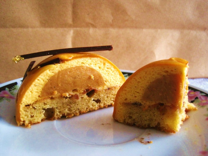 The “Roasted Pear” ($10) mousse-cake is a particular delight. Set on a sizeable almond pain de gene sponge layer, lightly-scented pear mousse enclose a centre of smooth caramel ganache with a slight coffee tone. It’s covered with a gelatinous gold layer and embellished with a chocolate sliver. A gorgeous orb of gold.