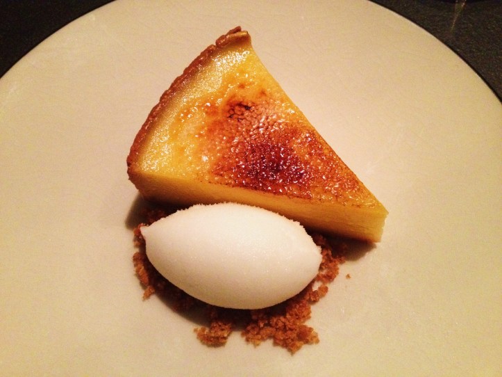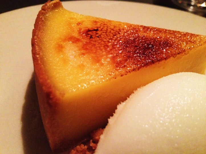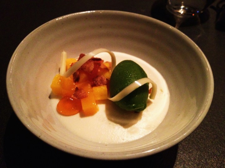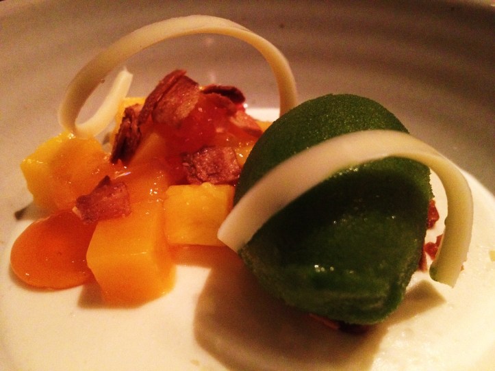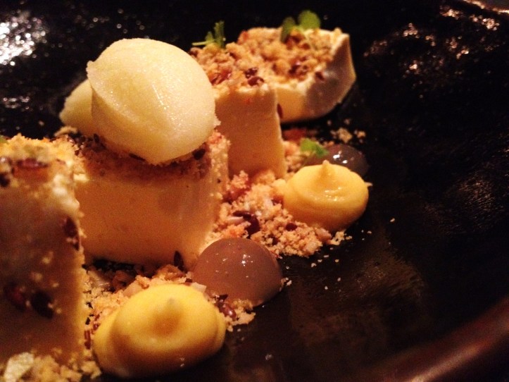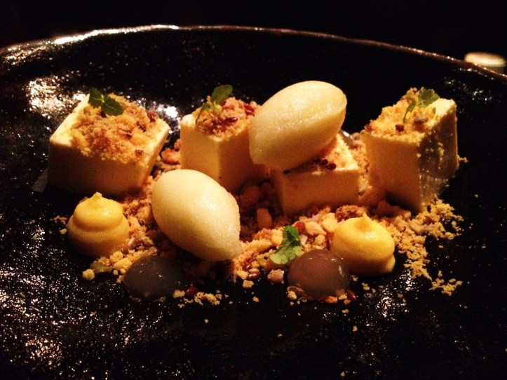 One of the more curious modern desserts, the deconstructed “Ricotta Cheesecake” ($16) was presented like a fairy’s playground. The centrepiece of the ricotta cheesecake had a tofu-ish mouthfeel. Like four stepping stones, they sat upon a base of crushed nuts over which were strewn droplets of soft ginger creme, piercing yuzu gel and sorbet pods. A light intermission.
