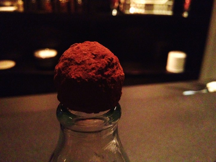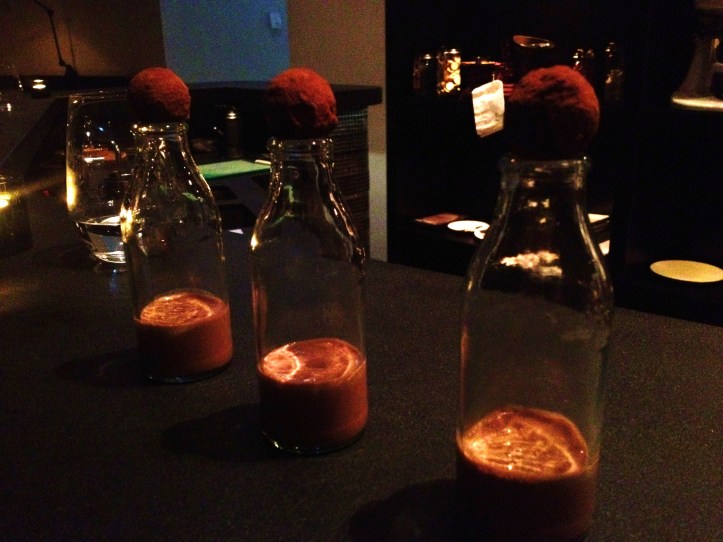 That’s not the end! Make sure you make space for the freebies! On our first visit, we didn’t and we moaned and groaned our way through, much to the concealed amusement of the dessert-pastry chef of the night. Your dessert bar experience is not finished with the last mouthful of your ordered desserts. Out came little glass bottles filled with shots of warm chocolate milk, stoppered by a caramel truffle that could potentially give London’s Paul A Young a run for his money..and certainly some of Melbourne’s chocolatiers. Simply glorious stuff.