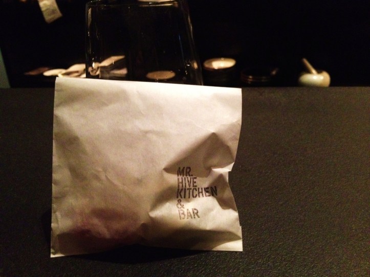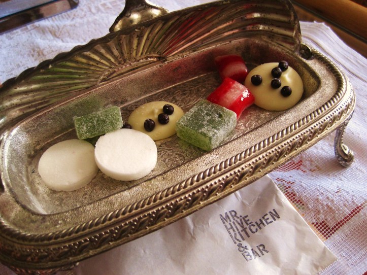 And because Mr Hive realises its dessert bar patrons are very very naughty people who cannot get enough of sugar, the dessert chef also handed us a paper bag of old-style handmade sweeties. It reminded us of two things. First, the exquisite sugarlands found in quaint English country townships where lollies fill huge glass canisters and receipts are hand-written, and where you visit for more sugar after a dollop of jam and clotted cream on fat scones. Second, it reminded us of our old primary school canteens, where one would pass a 50 cent coin over to the old lady in exchange for a bag of eucalyptus drops and twisted raspberry and liquorice ropes. Can you remember this? Ahh, it was just under two decades ago before the advent of silly “health food” edicts from our nanny-state government. But before we start on a rant on the dismal state of Australia’s domestic politics, let’s turn back to Mr Hive’s bag of joys — pastilles, fruit jellies, mint discs, boiled lollies. Imagine how much time and effort has gone into making such delights! A very cute, appreciated farewell touch. 😀