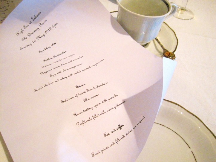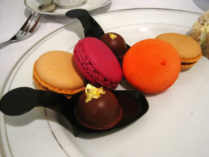 No scones followed, so sad. However, there was a quartet of sweets: an excellent puffy, custard-filled profiterole; a so-called, strangely named, “Asian tasting spoon” that was more raspberry jelly scoop topped with a dark bitter chocolate truffle than anything else; and two macarons for each person of a texture and flavour that reminded us exactly of that from La Belle Miette. We do believe they were indeed sourced from there!