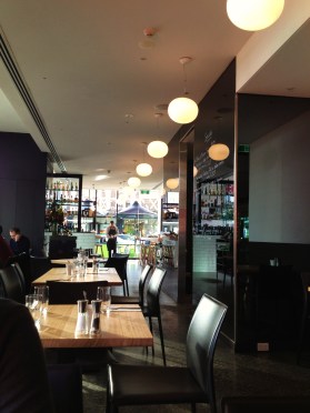 Occupying a corner space under the boutique Cullen Hotel, the Gramercy slinks and lounges in in trendy black. It’s a breezy bright place nonetheless. At the entrance, a small area furnished with warm timber stools overlooks the road, and adjacent to this is a bar with a backdrop of glistening bottles and a bench on which are set platters of voluptously proportioned muffins. A troupe of wait staff are headquartered at this bar and are perfectly positioned to call out in warm greetings while maintaining a constant, vigilant watch over diners. The Gramercy seamlessly flows into the main dining area of stark lines and square shapes, opening out at one side onto a very lovely covered al fresco area. It seems at once quintessentially Melbourne, but with a polished, rather than dilapidated or grunge, edge.